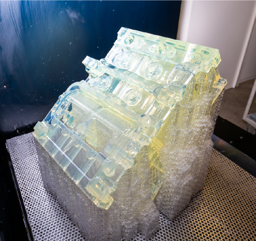 液体の光造形の場合はサポートを取り除く前に、付着した余分な材料の洗浄と、キュアと呼ばれる2次硬化(紫外線などを当てさらに硬化させる作業)を行ってからサポートを除去します。